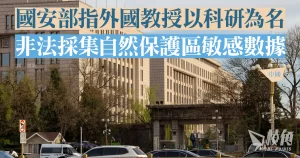 - 中國國安部周日晚發表文章稱,有外國教授在境外非政府組織支持下,藉「生態治理保護合作」等名義,非法採集、竊取中國重要自然保護區的地理、氣象、生物等敏感數據
