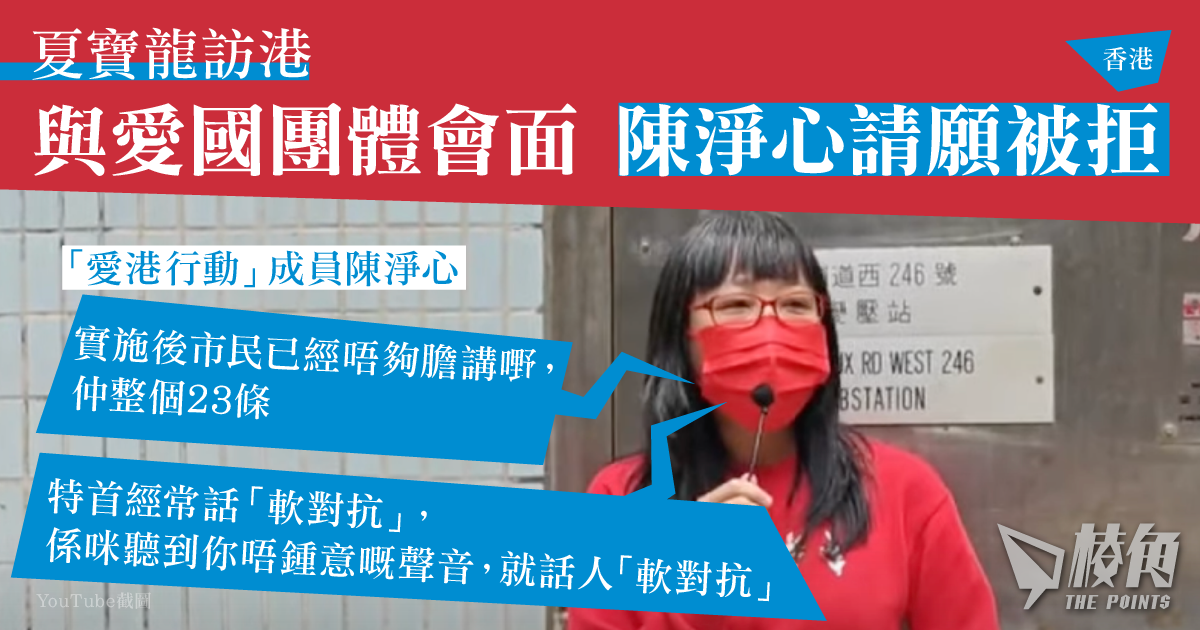 港澳辦主任夏寶龍一連七日訪港考察,繼上周與各主要官員會面後,周一(26日)與金融界、外國商會及多個愛國團體會面,據指內容談及民生及經濟。同日,「愛港行動」成員陳淨心到中聯辦外請願被拒,其後按警方指示到附近西營盤港鐵站外示威,並讀出寫給夏寶龍的信,指《國安法》扼殺港人的言論及新聞自由權利,又批評特首以「軟對抗」壓抑反對聲音,與過往支持政府的立場截然不同。