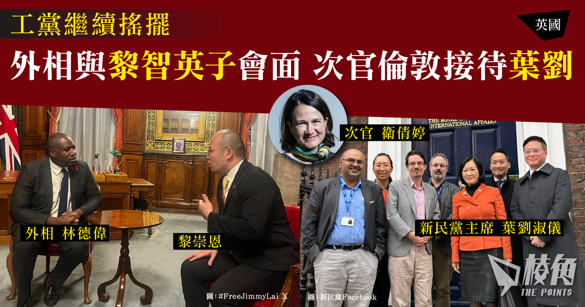 英國工黨政府的對華立場繼續搖擺不定。《壹傳媒》創辦人黎智英仍然在囚,其幼子黎崇恩上週,與剛出訪北京的外相林德偉會面;林德偉強調,黎智英案是英國政府的優先事項,會繼續呼籲港府釋放其父。另一邊廂,新民黨主席葉劉淑儀同期率團訪問倫敦,期間獲外交部次官衛倩婷接見,及訪問香港駐倫敦經貿辦。