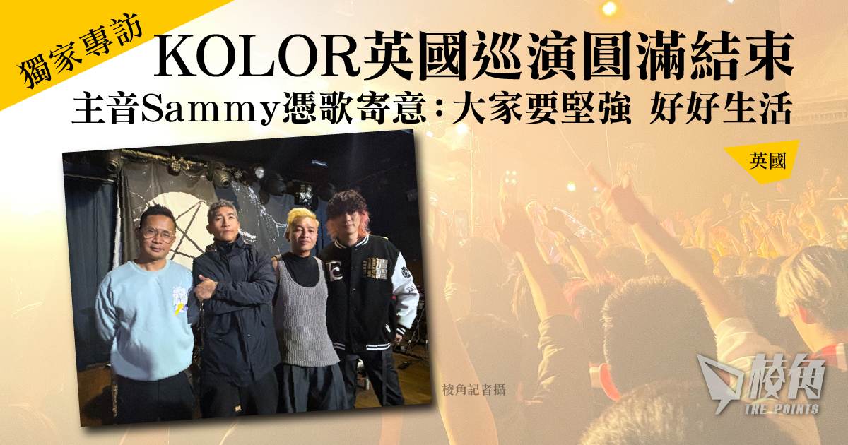 香港樂隊KOLOR首次英國巡迴演唱會「Touchdown」上周日(4月14日)於倫敦站圓滿結束。經歷過曼城及伯明翰場後,KOLOR四子包括主音蘇浩才(Sammy)、吉他手羅灝斌(Robin)、鼓手朱偉初(Michael)及低音吉他手謝日昇(Singz),連同J1M3及盧巧音,繼續於倫敦站揮灑熱血與汗水,亦得到歌迷的熱烈回應。KOLOR主音Sammy在演唱會上憑歌寄意,勉勵移英港人堅強,好好生活,日後一定會再見,又在唱《時差》時笑言:「今次終於沒有時差。」