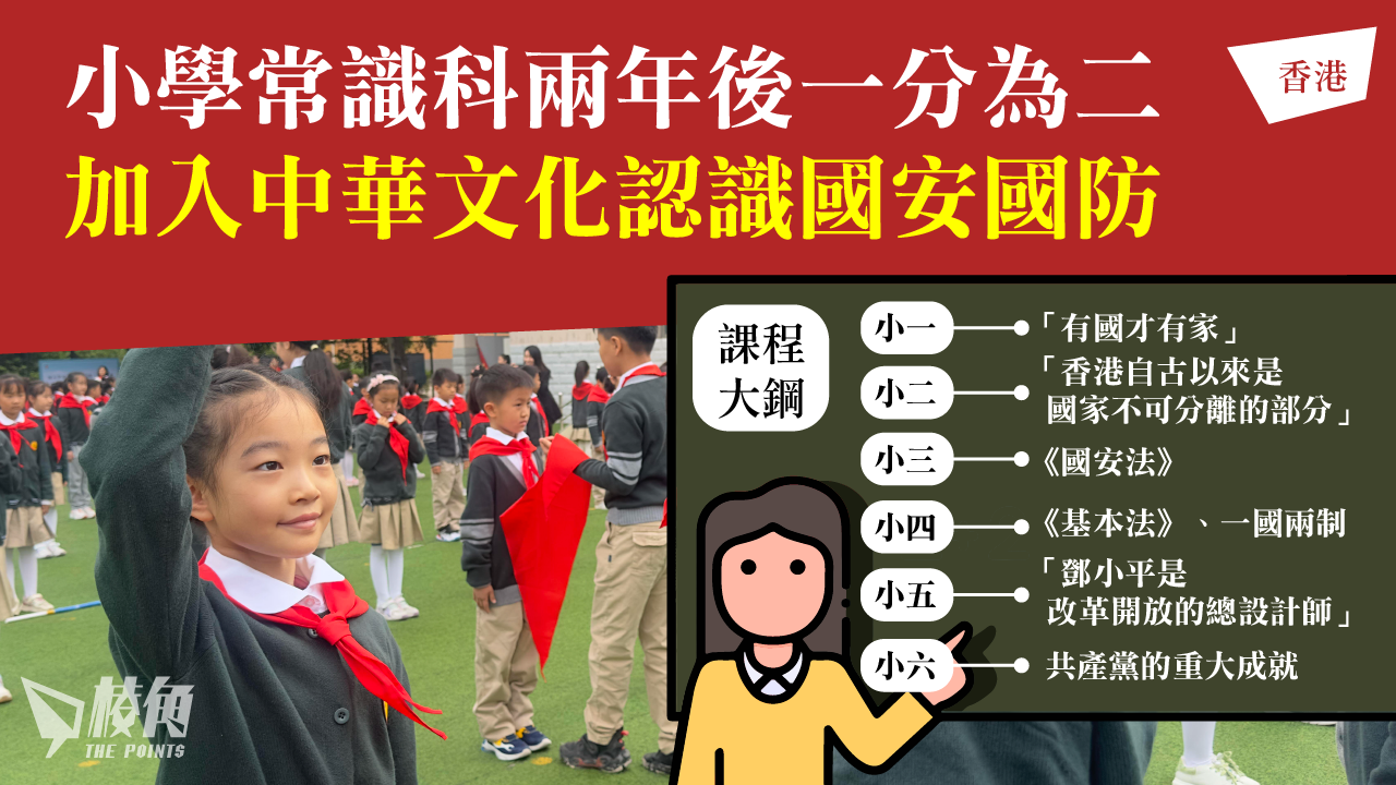 教育局周四(23日)公布,將小學常識科分拆為「人文科」與「科學科」,下學年試行。人文科課程有六個範疇,包括「健康與生活」、「環境與生活」、「理財與經濟」、「社會與公民」、「國家與我」,以及「世界與我」,內容涵蓋國民教育、《國安法》及認識中國共產黨的成就等。