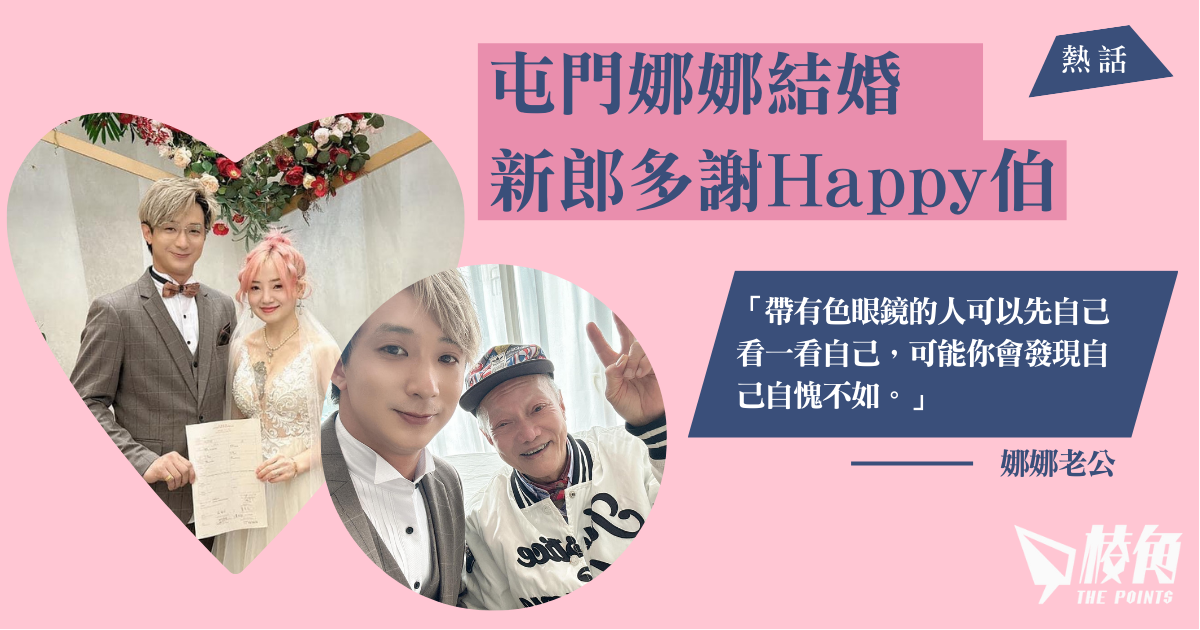 「屯門娜娜」的準老公Dick Cheung 在Facebook曬出多張相,Happy伯更大方舉V手勢與新郎合照,新郎更表示「感謝happy給大家歡樂」。