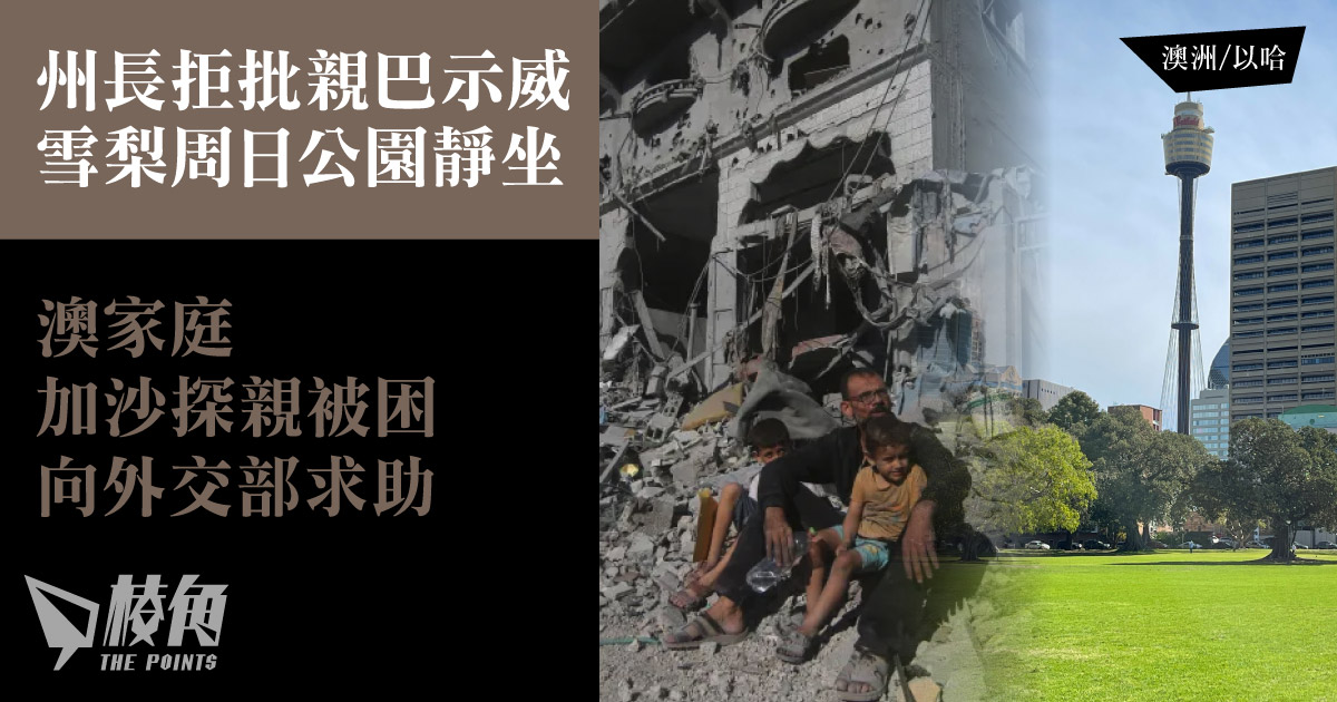 巴勒斯坦武裝組織哈馬斯恐怖襲擊以色列,以殘酷手段屠殺平民,挾持逾百人質到加沙,觸發以色列猛烈炮火攻擊加沙地帶。戰火造成逾2千多人死亡,以巴民族仇恨怒火也蔓延至世界各地。上周一,有親巴勒斯坦民眾在雪梨示威,有示威者高呼「用毒氣殺死猶太人」等反猶口號。今周日,他們將再次舉行集會,雖然改為公園靜坐,但新州州長范明思已明言不會批准集會。