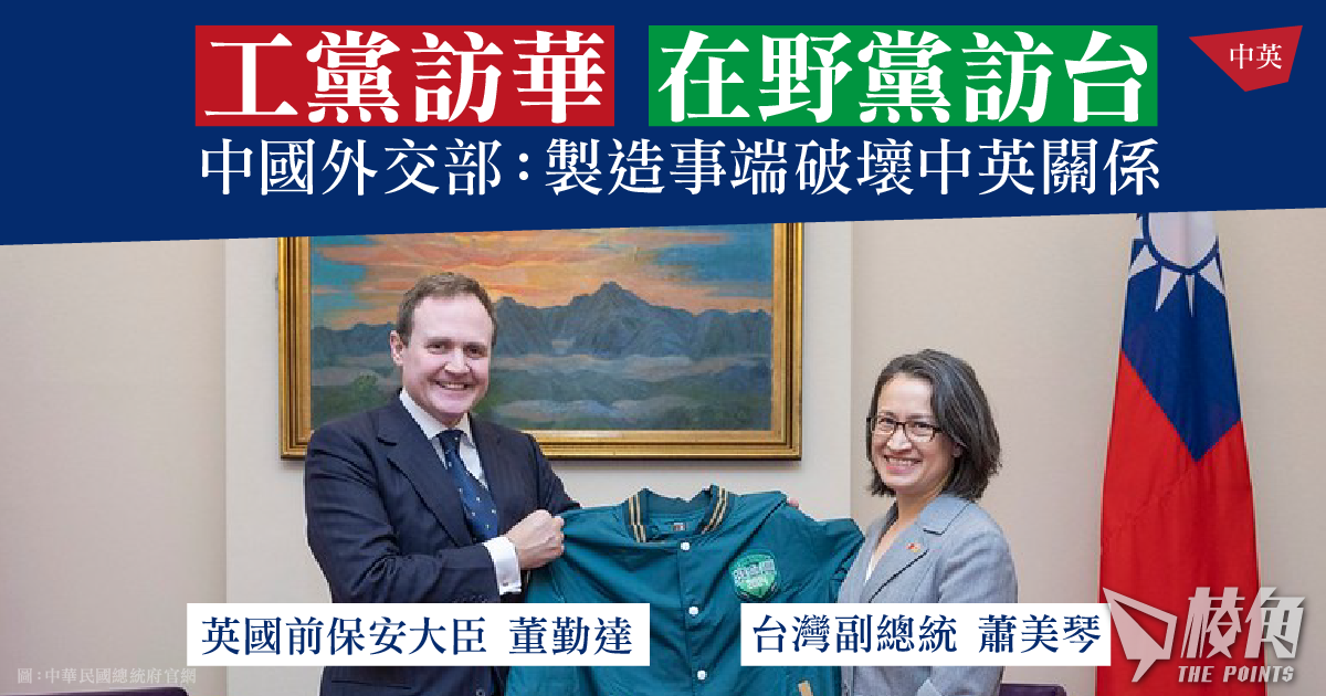 英國外相上周末訪京兩天被批向中方「叩頭」,在野保守黨下議員,前保安大臣董勤達(Tom Tugendhat)周一(13日)則到訪台灣,與副總統蕭美琴及多位官員會面。雙方就台海局勢、深化台英關係及對抗威權主義擴張等議題深入交換意見。中國外交部強烈譴責,指董勤達鼓動「台獨」分裂活動,製造事端破壞中英關係。