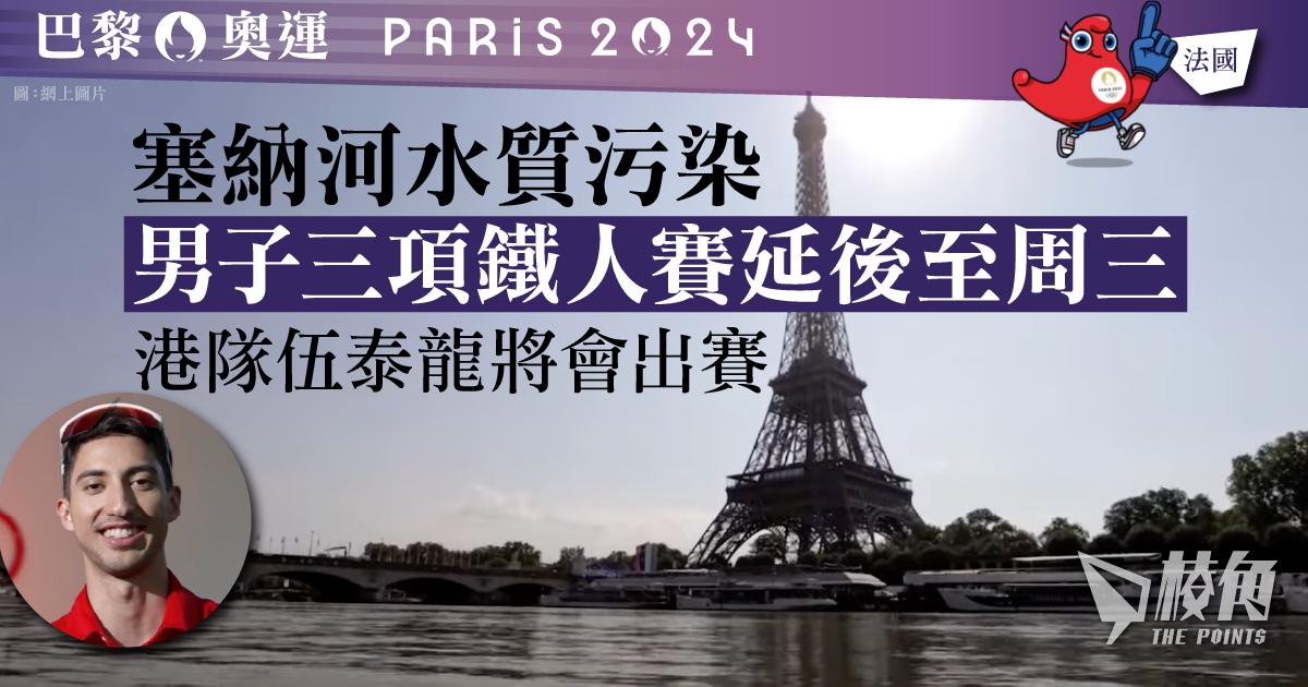 港隊伍泰龍將會出賽的巴黎奧運男子三項鐵人賽事原定於周二(7月30日)舉行,但因塞納河水質欠佳延期至周三(7月31日)女子組賽事後舉行。巴黎過去周末落大雨令塞納河水質轉差,部分賽道的含菌量仍然超標,三項鐵人項目自周日起連續兩日取消落水訓練。巴黎奧組委曾指,參考天氣預報後,有信心三鐵項目今日開賽前,塞納河污染物將回落至限值以下。