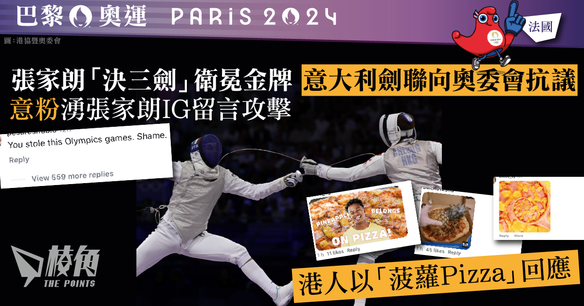 巴黎奧運男子花劍個人賽決賽,張家朗對戰意大利選手馬池(Filippo Macchi),決勝局最後一分3次重打,最終以15:14成功衛冕金牌,為港隊再創歷史。然而,屈居銀牌的意大利不服「決三劍」由中華台北裁判判定的賽果,又批評運動會不應由來自運動員鄰近地區的裁判參與。意大利劍擊聯會表示,已向國際奧委會及國際劍聯提出正式抗議。大批意大利隊支持者賽後到張家朗的Instgram個人專頁,留言諷刺賽果及言語攻擊等,港人則以意大利人討厭的「菠蘿薄餅圖」洗版回覆。