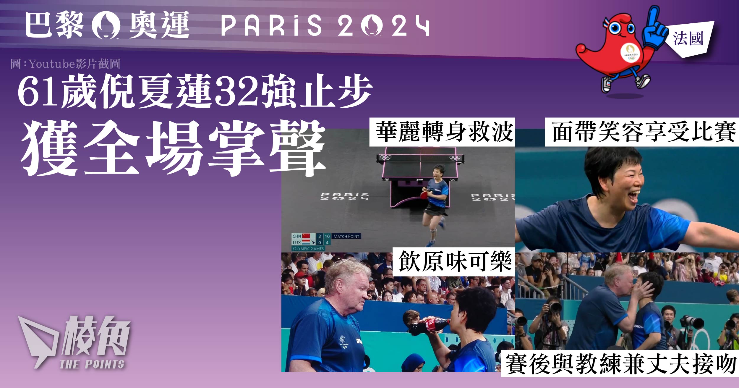 巴黎奧運周三(31日)乒乓女單上演「嫲孫戰」,奧運史上最年長的乒乓球手,61歲倪夏蓮6度出戰奧運,次圈比賽對世界排名第一、23歲中國球手孫穎莎,孫穎莎以直落4:0晉級。雖然倪夏蓮32強止步,但其快樂正面態度和享受體育的精神感染觀眾,獲得全場掌聲。她賽後接受傳媒訪問表示,能在奧運與孫穎莎對打是自己的夢想,亦希望觀眾享受她打出的好球。