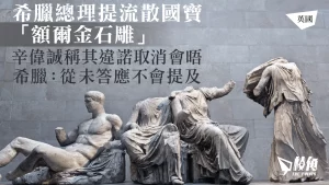 正在英國訪問的希臘總理米佐塔基斯(Kyriakos Mitsotakis)原定周二(11月28日)中午會與英國首相辛偉誠會晤。然而米佐塔基斯在星期日接受英國廣播公司訪問時,提及現藏於大英博物館的希臘國寶級文物「額爾金石雕」(Elgin Marbles),被辛偉誠稱其違反承諾而取消會面。希臘方面則稱從未答應不會提出有關文物的問題,又指該國對要求歸還流散文物的立場一向明確。是次外交風波並非兩國首次因文物歸屬問題引發爭端。
