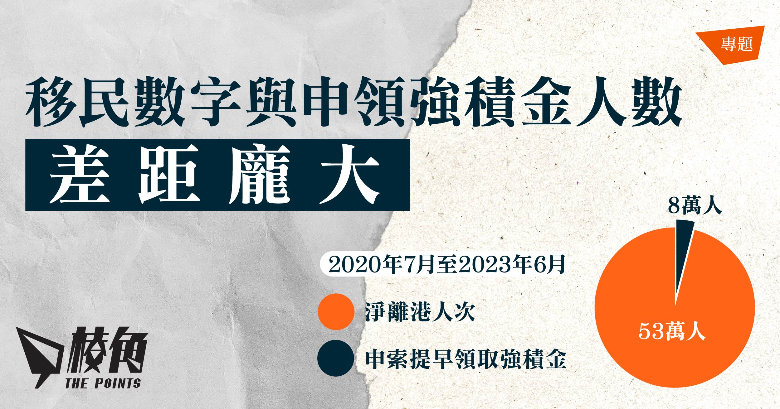 移居海外,除了要適應新生活,不少人面對的另一難題是,如何合法提早取回強積金(MPF)。移民潮之下,據入境處數字顯示,2020年7月實施《國安法》後的三年間,香港居民機場淨離港人次有53萬人。《棱角》翻查資料,自2020年第三季起,卻只有約8萬人以「永久離港」為由申索提早領取強積金,涉及金額達262.53億港元。換言之,未能取回強積金的離港市民數目龐大。《棱角》將連載三篇專題文章,分析強積金現況、揭露港府多宗疑似「出茅招」阻止移英港人提早領取強積金個案、及專業意見分析,敬請留意。