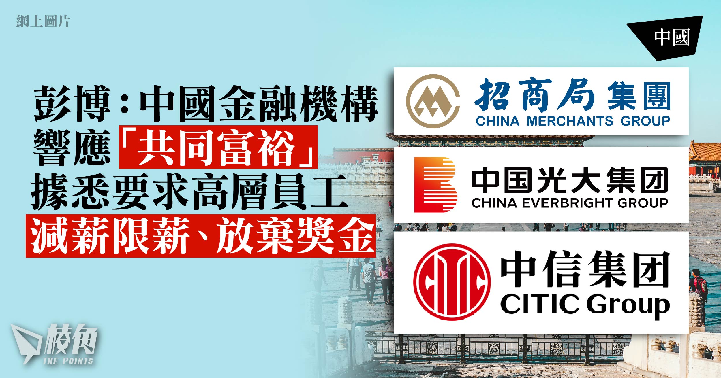 彭博引述消息人士指,為響應「共同富裕」,中國多間金融機構已要求個別高層員工放棄遞延獎金,並在個別情況下退回前幾年的工資,以遵守290萬人民幣的稅前薪資上限。