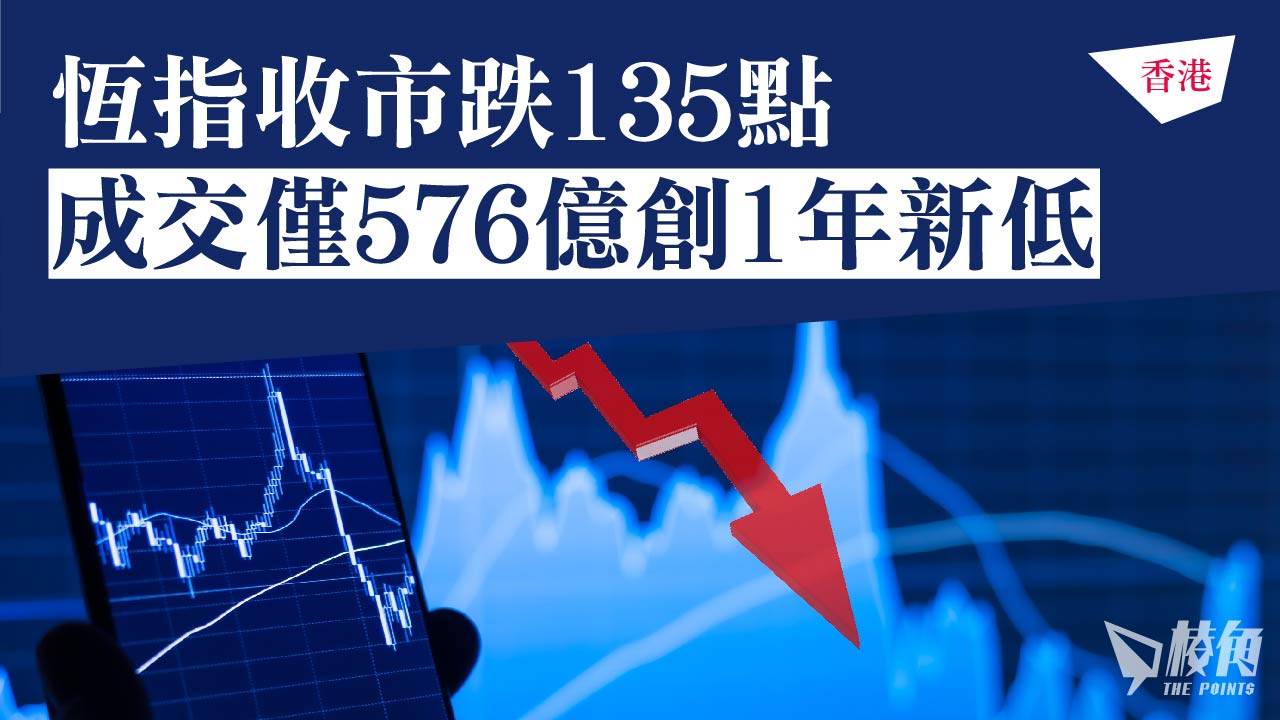 港股連跌兩日,周三(4日)再創一年新低。恒指最多跌近240點,低位見17094點,下午跌幅收窄至135點,收市報17195點,跌幅達0.8%,成交額約576億元,是自去年10月的最新低。
