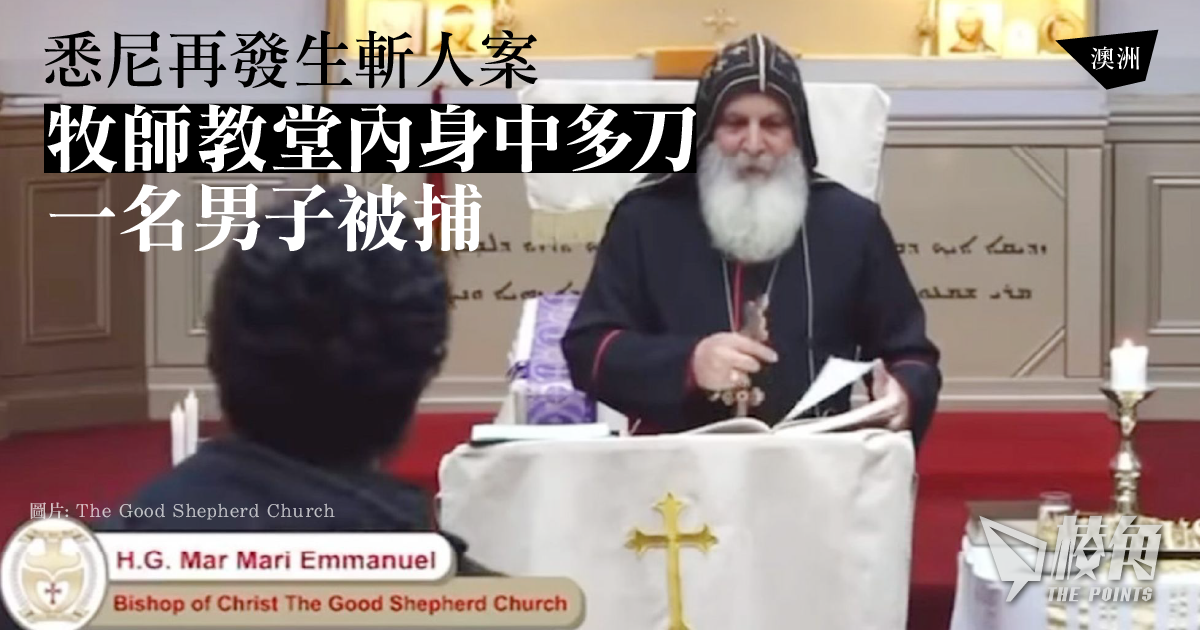 澳洲悉尼一週內再次發生斬人案,有人持刀闖入悉尼西部一間教堂施襲,一名牧師身中多刀,至少4人受傷,警方稱已拘捕一名男子。該教會在網上直播儀式,施襲過程亦同步顯示在直播畫面。