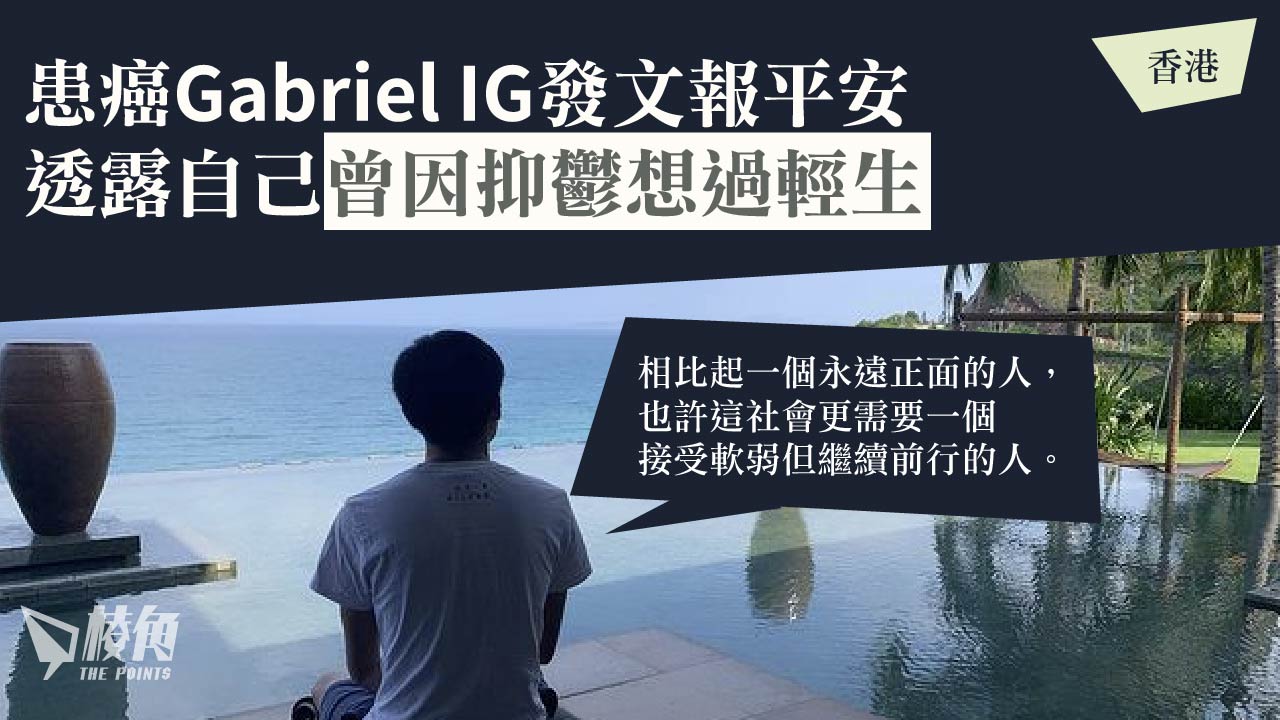上月,患上末期癌症的楊嘉驃(Gabriel)向兒童癌病基金捐出80萬,為患癌兒童支助藥物,其後獲港人及英超愛隊愛華頓打氣,外界一直關注Gabriel的病情。周三(8日)晚上,Gabriel在社交平台發文報平安,指自己已回家休養,文中亦交代自己早前入院原因,透露自己患癌後再患上抑鬱症,更曾經有輕生的念頭,勸勉大家正視抑鬱症並勇於尋求協助。