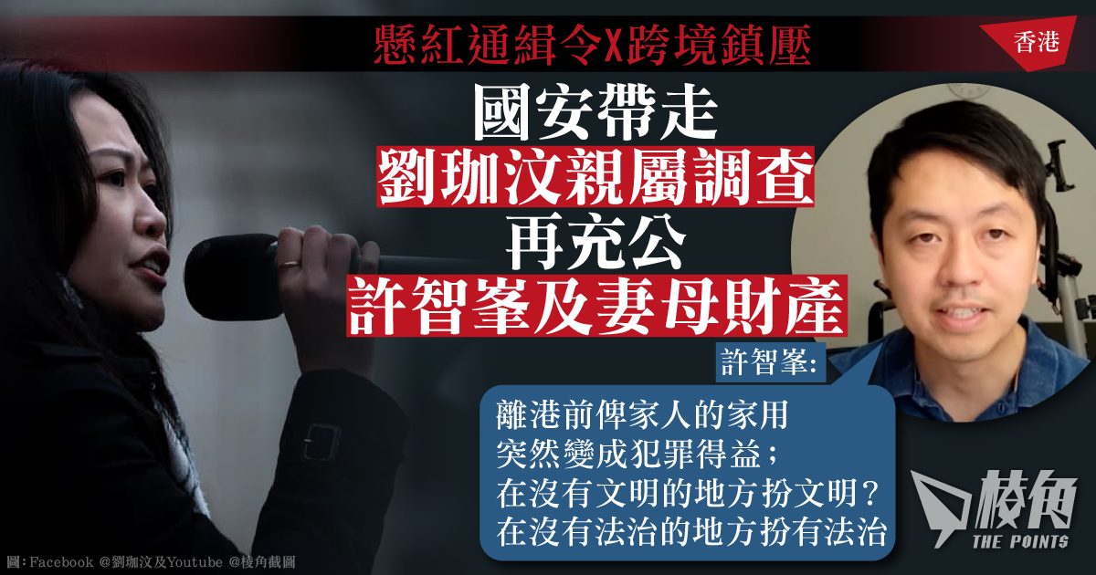港府國安處針對被懸紅通緝海外港人的在港家屬發起多次行動。前黃大仙區議員、香港民主委員會(HKDC)成員劉珈汶,繼上周其在港的姑姐及姑丈被警方帶走調查後,周一(17日)再有另一位姑姐被帶走助查。另外,法庭周一(17日)宣布港府提出沒收令申請成功,將充公前立法會議員許智峯、其太太及母親在香港的財產,涉款項逾80萬港元。港府同日深夜發稿,強烈譴責有人抹黑和惡意攻擊法庭決定。許智峯回應,斥港府把自己離港前給家人的生活費指控為「犯罪得益」,形容港府行為猶如「抄家」,無視社會法治與文明。
