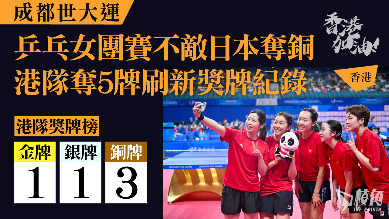 世界大學生運動會7月28日於成都揭幕,香港隊今屆派出歷來最多運動員參賽,亦首次有奧運金牌得主出戰。賽事進行四天,港隊共取得5面獎牌,刷新單屆最多獎牌紀錄。最新一面獎牌由女子乒乓球隊奪得,雖然四強不敵日本,但仍然為港隊取得首面世大運乒乓球獎牌,可喜可賀。