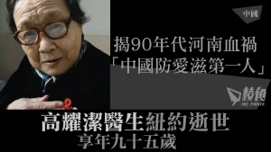 有「中國防愛滋第一人」之稱、參與揭發90年代河南賣血及「血漿經濟」導致愛滋病蔓延成「血禍」的高耀潔醫生,於周日(12月10日)在紐約逝世,享年95歲。高耀潔自90年代起即致力投身於中國的愛滋病防治工作,但就因屢屢揭發河南地方官員隱瞞省內的愛滋病擴散情況而遭當局打壓,最終在2009年出走美國。她的友人在周日向傳媒表示其於家中自然離世。