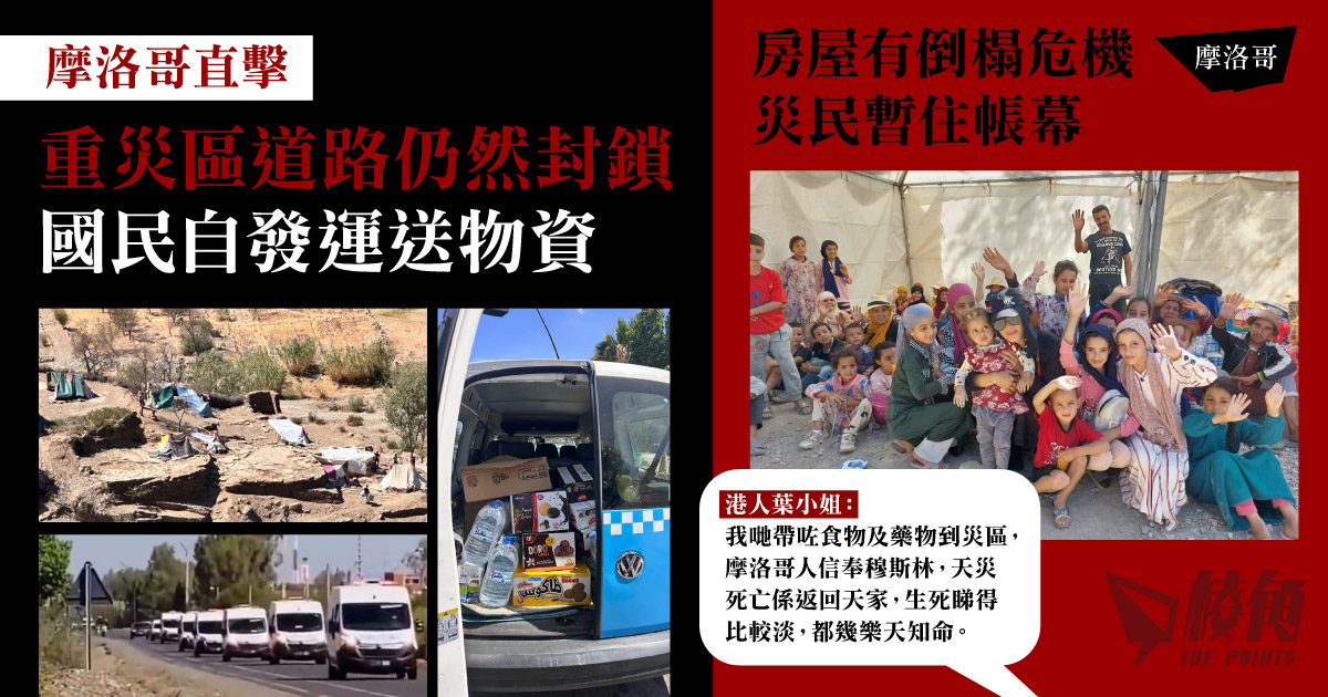 摩洛哥地震目前造成的死亡人數已逾2800人,重災區的道路仍然被封鎖,房屋倒塌情況嚴重,不少災民逃離被摧毀的村莊,暫時在政府搭建的帳幕裡面,物資仍然短缺。居於索維拉的香港人周二將搜集到的食物、食水及藥物,送到距離索維拉約一小時車程的災區,派送物資。