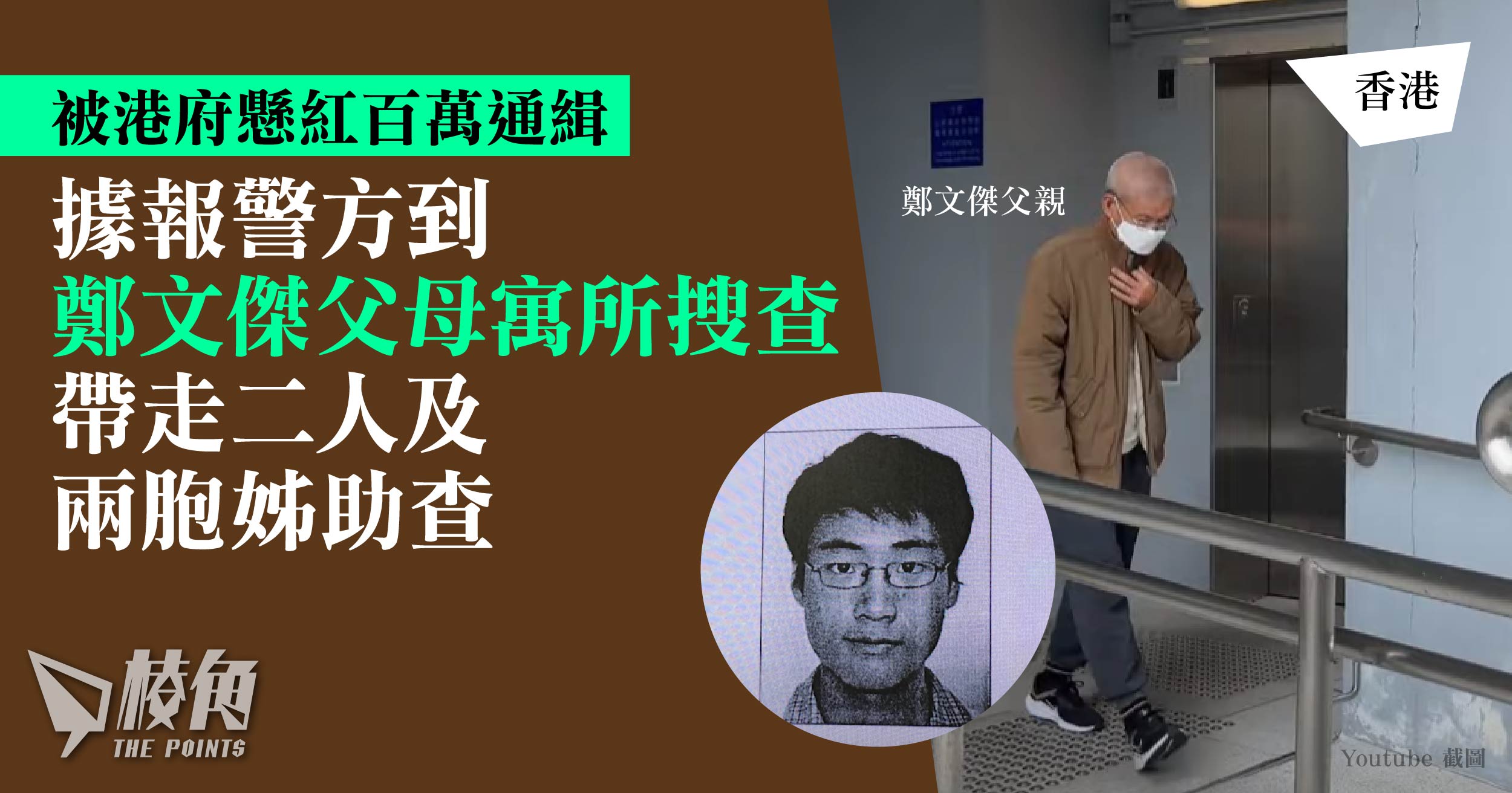 據多間傳媒報道,警方周三(10日)早上曾到鄭文傑父母位置屯門區的住所搜查,其後分別帶走父母二人及鄭文傑兩名胞姊協助調查。鄭父在青山警署接受調查後,約下午12時半離開,其餘三人亦先離開警署。《Yahoo 新聞》引述消息指,國安處人員帶四人,調查他們是否仍與鄭文傑有任何形式的聯絡或是金錢往來。《棱角》已向鄭文傑查詢,未獲回覆。