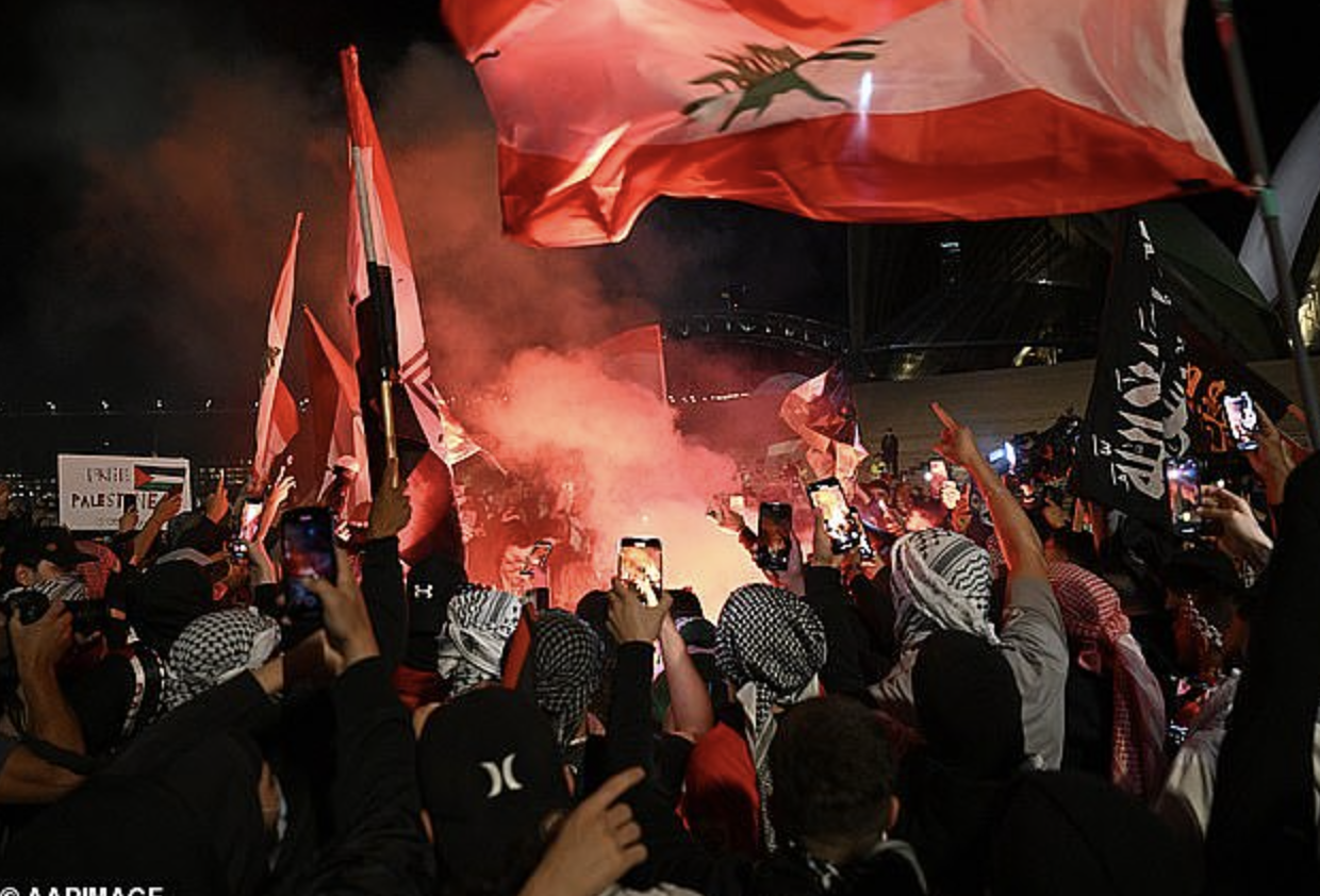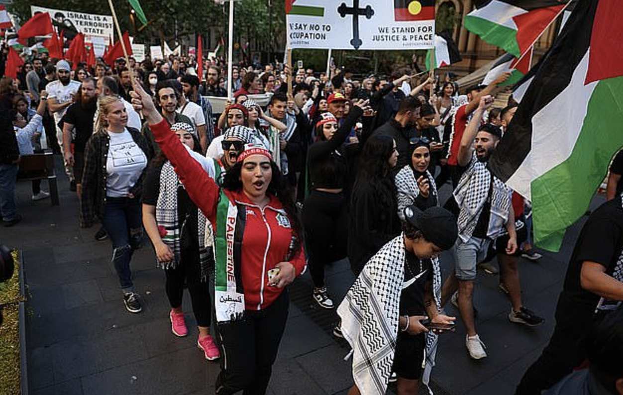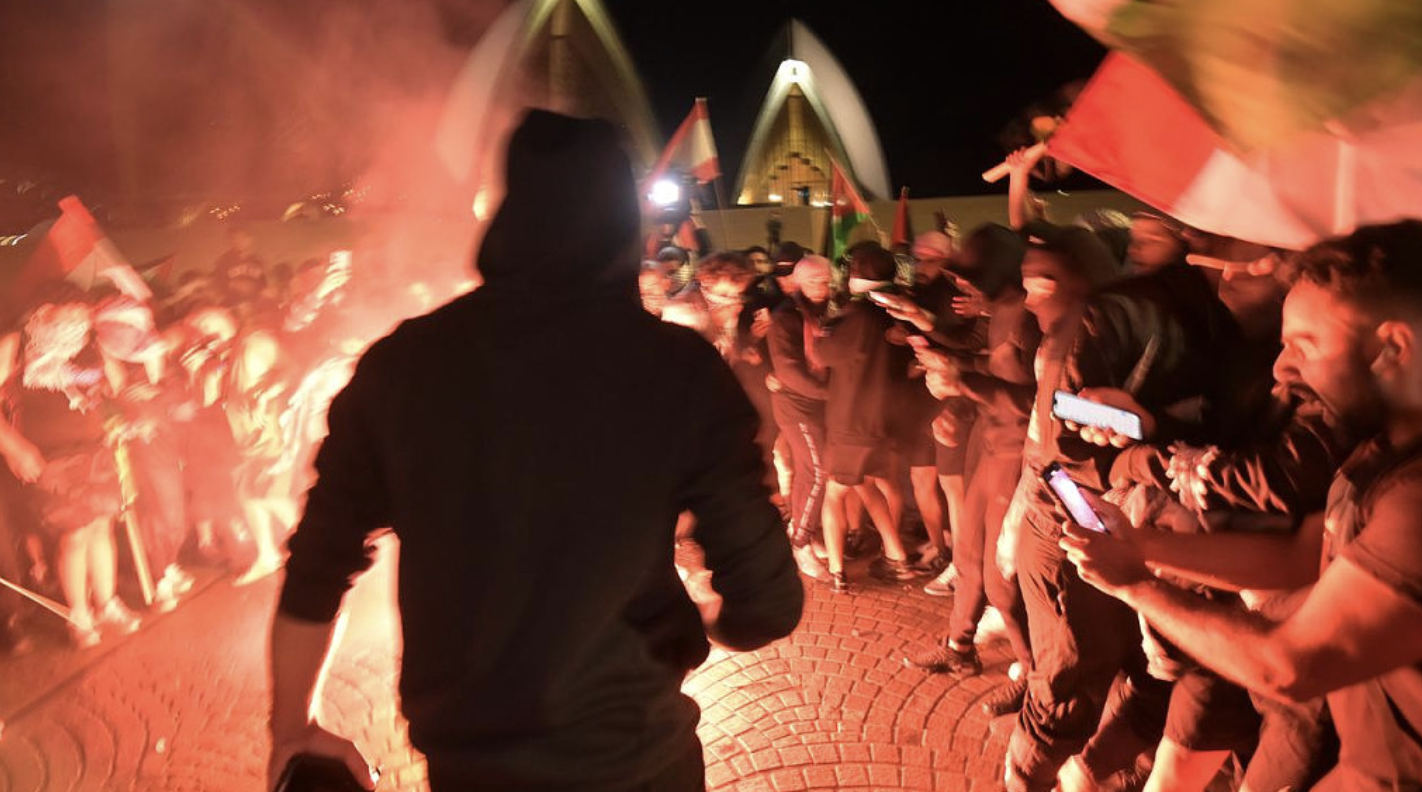 10月9日周一晚,雪梨歌劇院亮起藍白燈光,支持以色列。當日支持以色列的民眾,在歌劇院的另一邊遙望,避開支持哈馬斯的巴裔示威者的遊行路線。當晚數百名巴裔示威者,當中包括小孩,手持巴勒斯坦國旗,從市議會出發遊行至雪梨歌劇院。其間,示威群眾不斷高呼「Fxxx Isarel」和「Fxxx the Jews」,以粗口辱駡以色列及猷太人,高呼「解放巴勒斯坦」及「真主偉大」,當中有小孩手持大聲公高叫號。