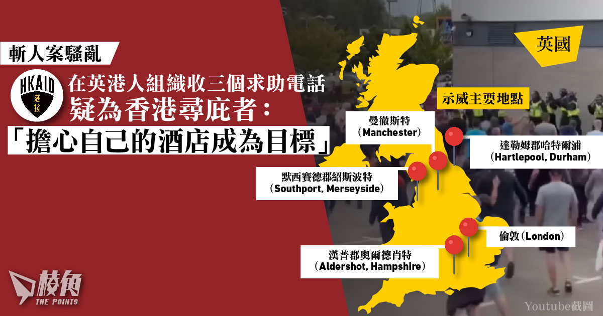 英國反移民示威自7月30日爆發至今已一個星期,形勢不但未受控,反而蔓延至超過20個市鎮,根據美國之音報道,三名來自香港的尋求庇護者,包括老、中、青人士,在緊張氣氛下求助,擔心自己的酒店成為目標。在英港人組織「港援」(Hong Kong Aid)向《棱角》證實,曾通過電話收到求助,但基於安全及私隱考慮,一般不會驗證個人資料及居留身份,因此無法確認求助人身份是否來自香港。「港援」亦表示,暫時未收到其他港人關於示威的求助。