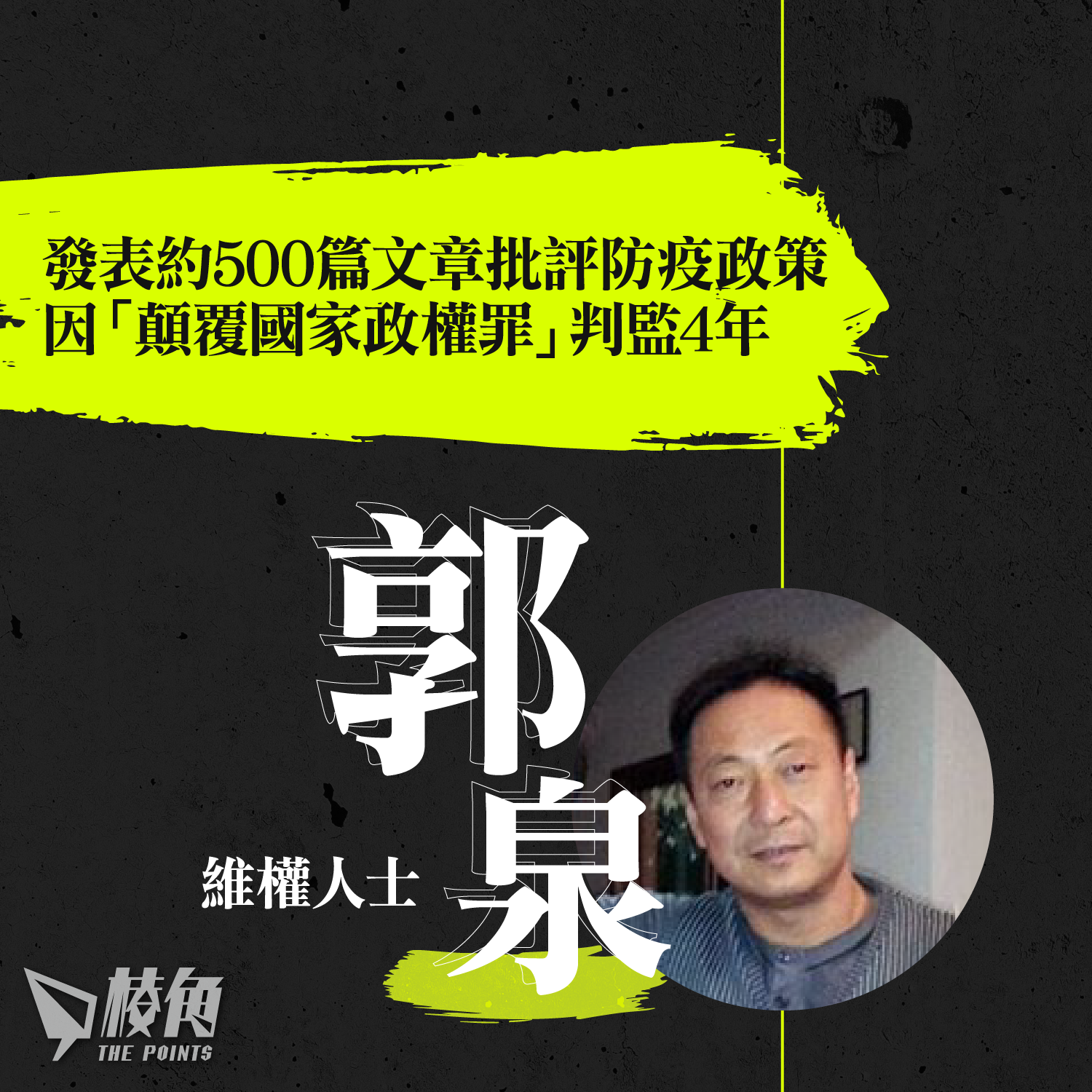 江蘇維權人士郭泉以往一直在網站撰寫文章《郭泉語錄》批評中共政府,包括要求當局改憲、質疑四川地震賑災不力等。2009年曾因「顛覆國家政權罪」被判監10年,剝奪政治權利3年。