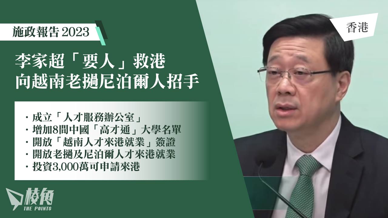 行政長官李家超周三(25日)發表任內第二份施政報告,港府一直指香港沒有「移民潮」,但在施政報告中,加入了不少「搶人才」政策。由過往主要向中國大陸及歐洲國家吸引專才,如今擴展至向其他東南亞國家招手,當中包括開放越南、老撾及尼泊爾來港的就業簽證;及新增「高才通」的合資格院校;另外,港府推「資本投資者入境計劃」,在港投資3,000萬元或以上合資格人士可申請來港。