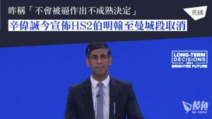 英國HS2高鐵伯明翰至曼徹斯特段的前景近月備受關注,首相辛偉誠在月來連番迴避記者追問及拒絕評論後,終於在今天(10月4日)宣佈取消項目,意味着原計劃連接首都倫敦和英格蘭中北部的HS2高鐵項目只餘下第一期倫敦至伯明翰段仍在進行。消息公佈前,辛偉誠昨日(10月3日)曾對BBC就該項目是否取消表示,他「不會被逼作出不成熟的決定」。