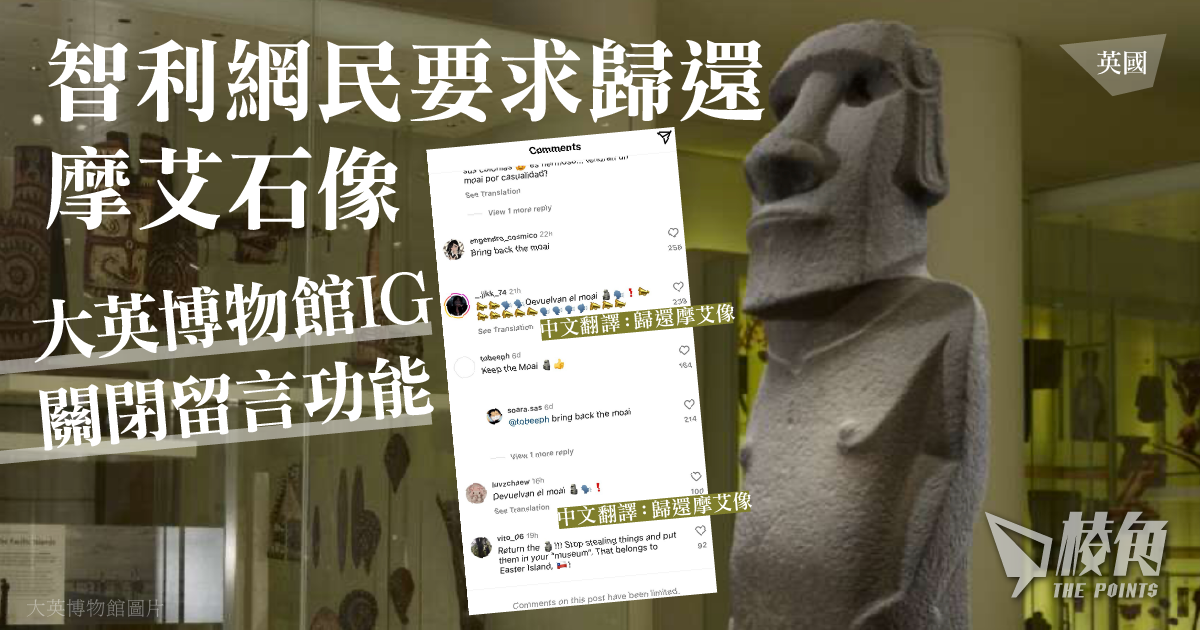 據《BBC》周一(19日)報道,一名來自智利的網絡紅人發起「歸還摩艾」網絡行動,鼓勵智利網民湧入英國大英博物館的社交平台Instagram帳號留言,要求當局向智利政府歸還一個復活節島(Easter Island)的摩艾像(Moái),並獲智利總統博里奇(Gabriel Boric)認同。大英博物館的Instagram帳號在同日,被發現已關閉所有帖文的留言功能。