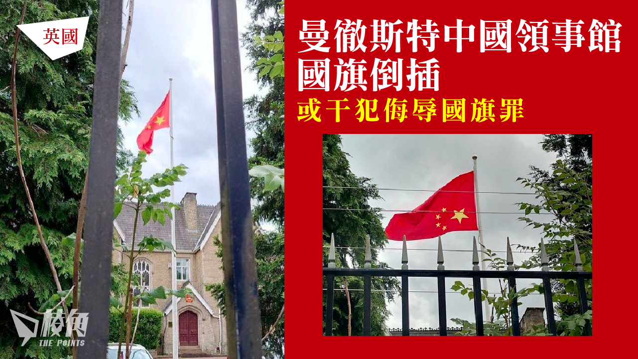 早前涉中國官員毆打香港示威者的中國駐曼徹斯特總領事館,周一(7日)被發現門外的國旗被倒掛。《棱角》已向該領事館查詢,倒掛國旗是否人為或有其他意味,暫時未有回覆。根據《侮辱國旗罪》最新修訂指,公民或組織「得倒掛或者以其他有損國旗運動員的方式升掛、使用國旗」。