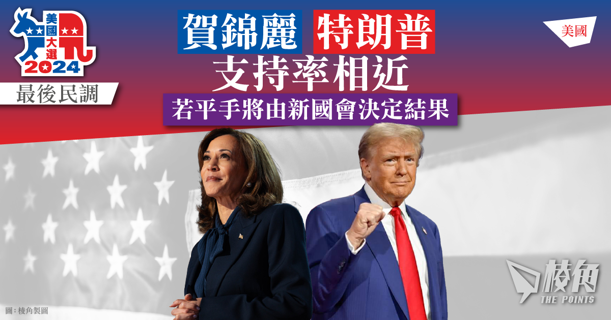 - 民主黨總統候選人賀錦麗,及共和黨總統候選人特朗普支持率相近