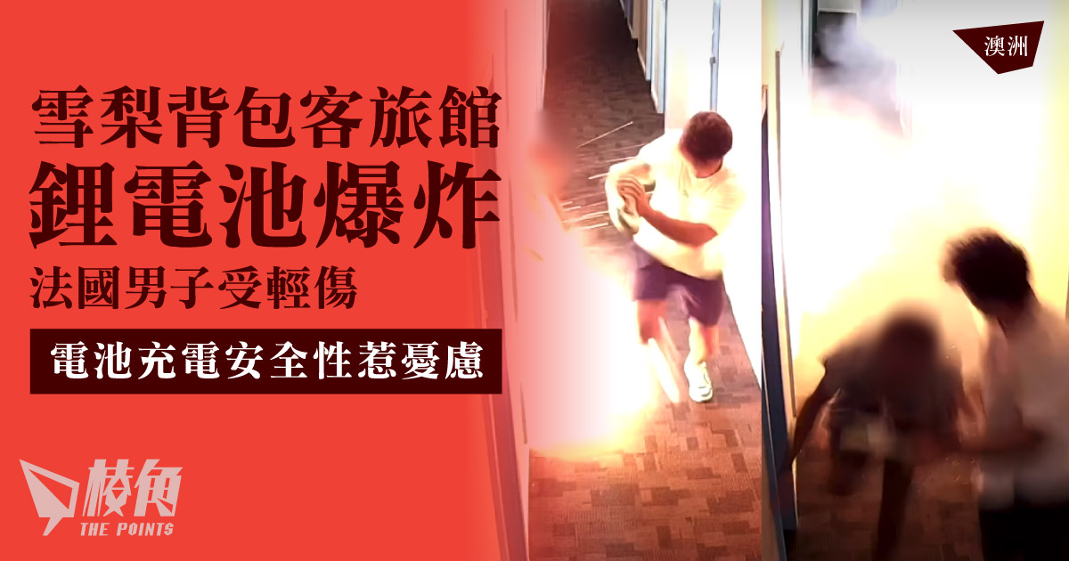 澳洲雪梨Potts Point一間招待背包客為主的旅館,在10月4日發生火災,疑涉電動單車的電池充電過熱爆炸所致。新州消防局(Fire and Rescue NSW)發放一段旅館走廊的CCTV影片,見當時一名男子站在房間外,突然房內爆出猛烈火舌,男子急速躲避,同時另一名男子衝出房間。事件中一名法籍男子受輕傷。