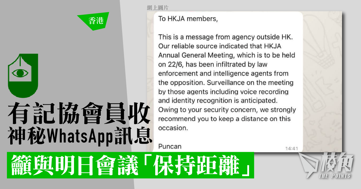 綜合多家傳媒報道,記協周五向會員傳送通知,表示有會員今日收到聲稱來自香港境外機構的WhatsApp英文訊息,內容指根據可靠情報,得知6月22日舉行的記協周年大會被執法及情報機關監視,又指對方會在會議中錄音以辨別身分,因此「強烈建議與活動保持距離」(strongly recommend you to keep a distance on this occasion),而訊息下款只有一個簡單英文名字「Puncan」。