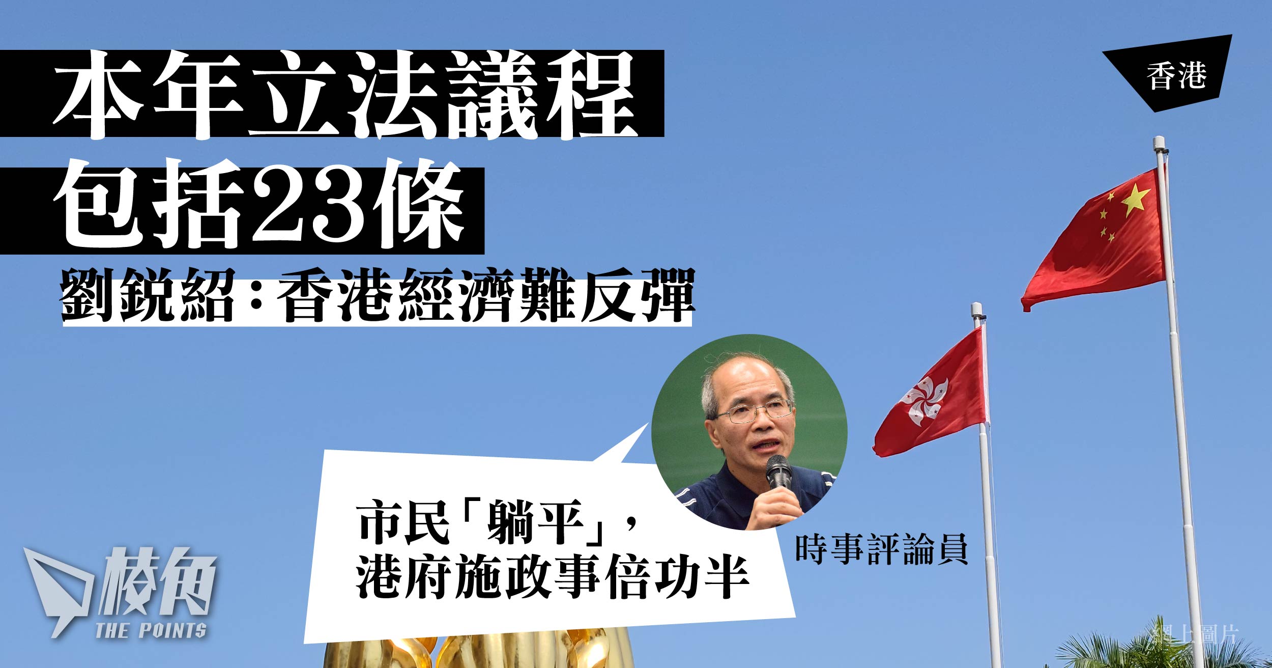 《基本法》23條立法過去被外界形容為「惡法」,國安監控範圍由本地擴展至外國人和企業,以有效應對國家安全風險及威脅。其中《基本法》第23條被指比原訂「更辣」,港府曾表示有意納入「竊取國家機密罪」、「間諜罪」及「軟對抗」等罪行,不排除參考大陸《國安法》,最高刑罰恐終身監禁。過往港府曾急推「惡法」引起大規模遊行示威,包括2012年「反國教」大遊行、2019年「反送中」運動,劉銳紹指不會再有另一場政治運動,「市民用腳投票,要移民的都走了,剩下的會『躺平』,大家不會再作無謂的犧牲。」但他認為市民「躺平」對港府的傷害更大,「官方政策一定會事倍功半,港府勸大家留港消費,市民便雞飛狗走;區議會選舉投票率得27%,連廢票都不投,日後要實施任何政策,市民都不會理睬。」