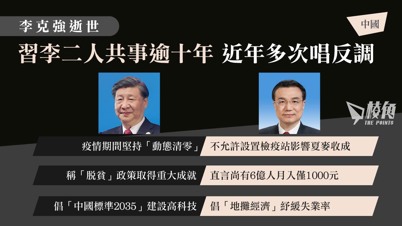 國務院前總理李克強,周五(27日)凌晨逝世,終年68歲。李克強今年三月卸任,據報到上海休息後突然因心臟病發離世。疫情期間至今,從政策實施到描述國家經濟發展,李克強與中國國家主席習近平的發言及作風出現多次明顯角力,加上習近平上任後加強集權,安插親信以逐步削弱李克強於黨內的權力,其死訊引起外界揣測。