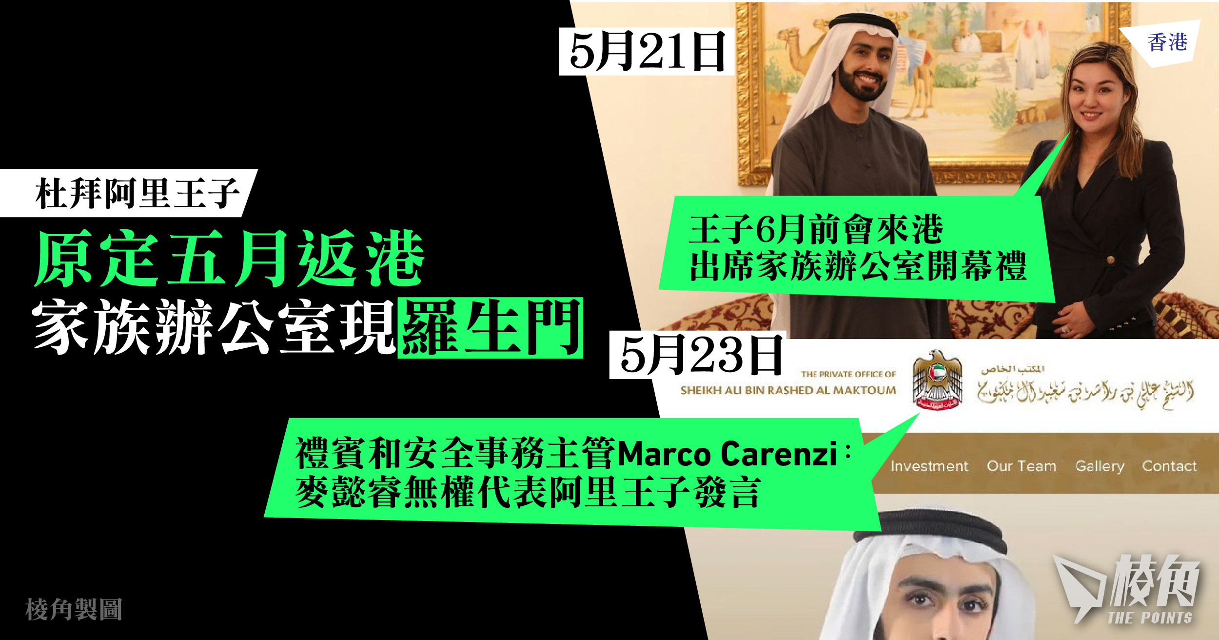杜拜阿里王子原先表示五月會再次來港,出席家族辦公室的開幕禮。辦公室行政總裁麥懿睿日前接受傳媒訪問時表示,阿里王子會在幾星期內到港。然而,阿里王子在杜拜的禮賓和安全事務主管周四(23日)透過傳媒反駁,指麥懿睿無權代表王子發言。