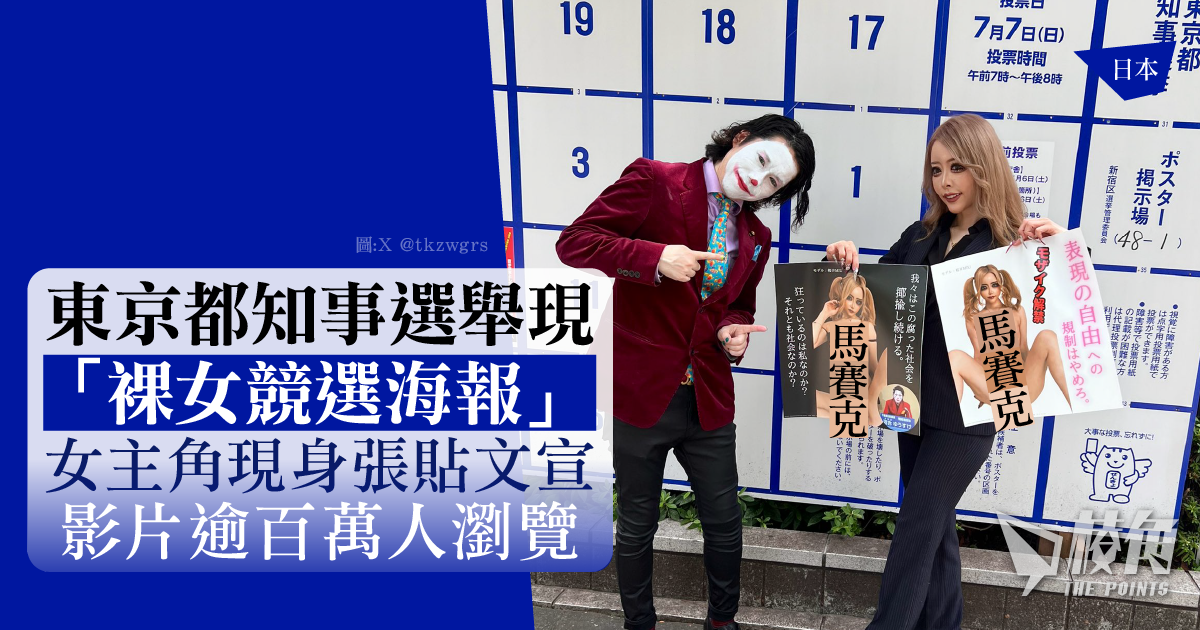 在東京都廳附近的公布欄,某位無黨參選人的公告欄上,便張貼了一張私密處等身體部位被貼上貼紙的「裸女競選海報」,主張「表現自由」。海報女主角更親自現身張貼文宣的影片,並刊登在社交媒體X平台上,截至周五(6月21日)上午11時半,該條短短45秒的影片已吸引超過350萬人觀看。