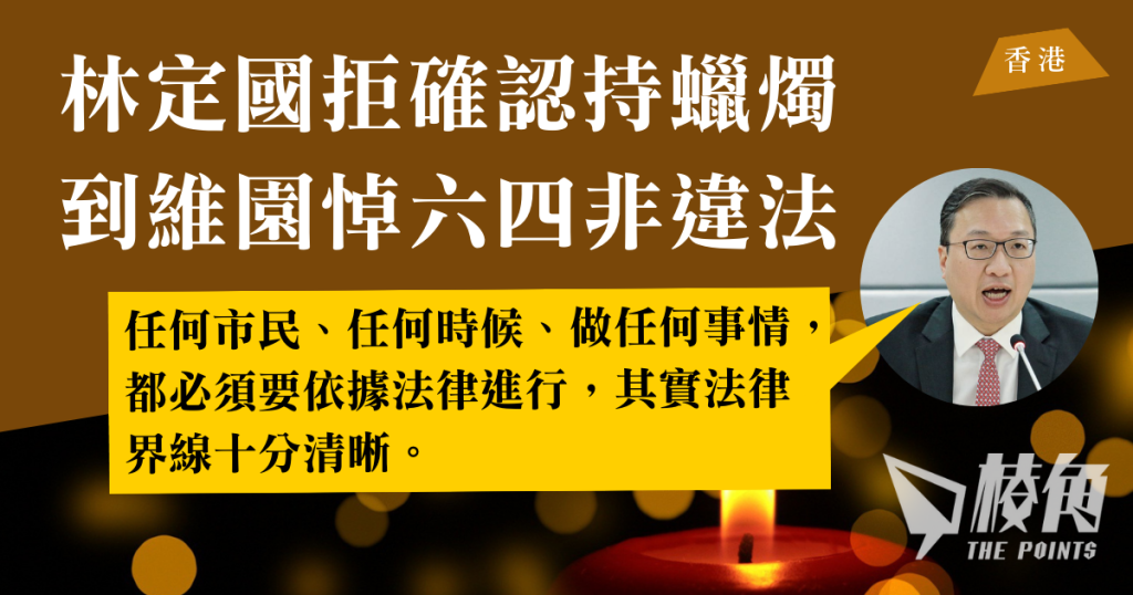 距離「六四事件」34周年僅餘2天,在現今香港的社會環境下,市民自發到維多利亞公園悼念是否仍然合法相信是不少港人心目中的疑問。香港有記者趁律政司司長林定國結束五天訪京行程後見記者時,向他詢問市民自發手持蠟燭到維園是否違法,惟他並沒有給出確切回答合法與否,僅指市民要依法行事,而「法律界線清晰」。