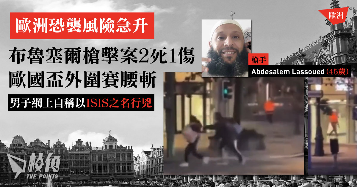 比利時首都布魯塞爾10月16日晚發生恐怖襲擊,一名男子當街向途人開槍,造成兩名瑞典人死亡。當時附近正舉行歐洲國家杯外圍賽,也因為安全問題即時腰斬。 目前兇手仍然在逃,已將恐襲警報提升至最高級別。署名Slayem Slouma在網上發放一段槍手的影片,自稱叫Abdesalem Al Guilani,聲稱以伊斯蘭國(ISIS) 之名行凶。之後這名疑兇被揭名為Abdesalem Lassoued。