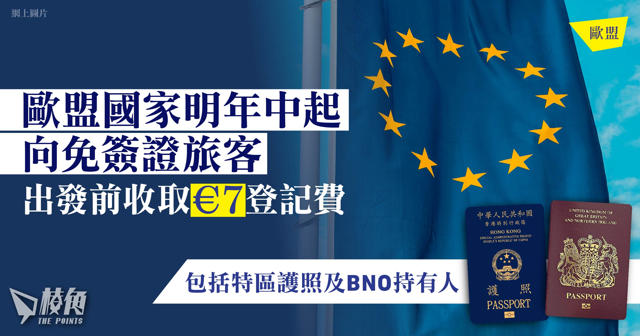 歐盟及神根地區(Schengen Area)國家推出兩項新入境措施,明年中起要求免簽證入境國家旅客,在入境歐洲前,於「歐盟旅行資訊及授權系統」(ETIAS)進行登記,過程會收費7歐元(約港幣59元),香港特區護照及BNO持有人包括亦在內。另外,今年第三季起歐盟將採用新出入境系統,蒐集入境旅客的面孔及指紋,代替在護照上蓋印紀錄。