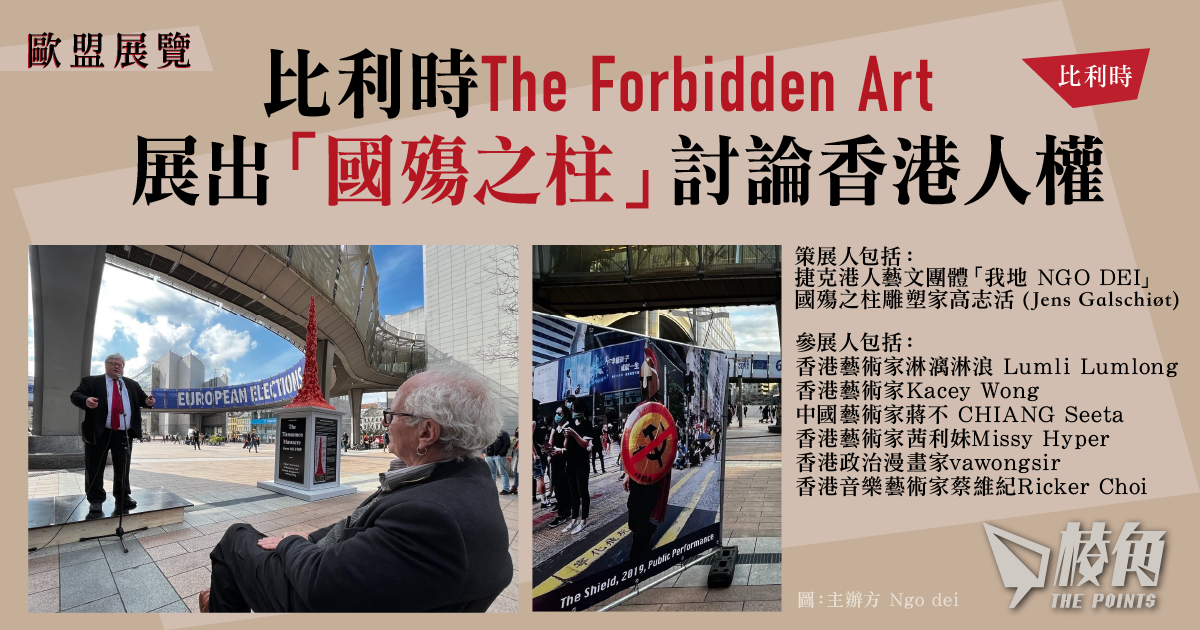 歐洲議會由周二(3月19日)起一連兩日在比利時布魯塞爾(Brussels)舉辦The Forbidden Art展覽,由捷克港人藝文團體「我地 NGO DEI」及丹麥藝術家高志活(Jens Galschiøt)策展,主題圍繞人權議題。展出作品包括被香港政府拆除、由高志活創作的「國殤之柱」、香港藝術家淋漓淋浪 Lumli Lumlong的油畫作品「蘋果人」和Kacey Wong作品「The Shield反極權之盾」等。