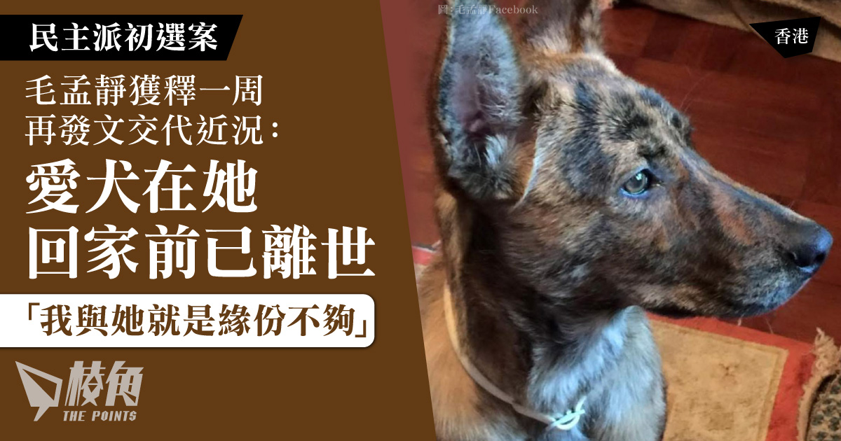 因串謀顛覆國家政權罪而判監50個月的前立法會議員毛孟靜上周刑滿出獄,可惜未能與愛犬重聚。她周三(7日)在Facebook透露,十年前開始飼養的愛犬Marble已於去年六月離世,而且走得頗突然,死因是腎衰竭,享年僅十歲,火葬後骨灰留在家中。