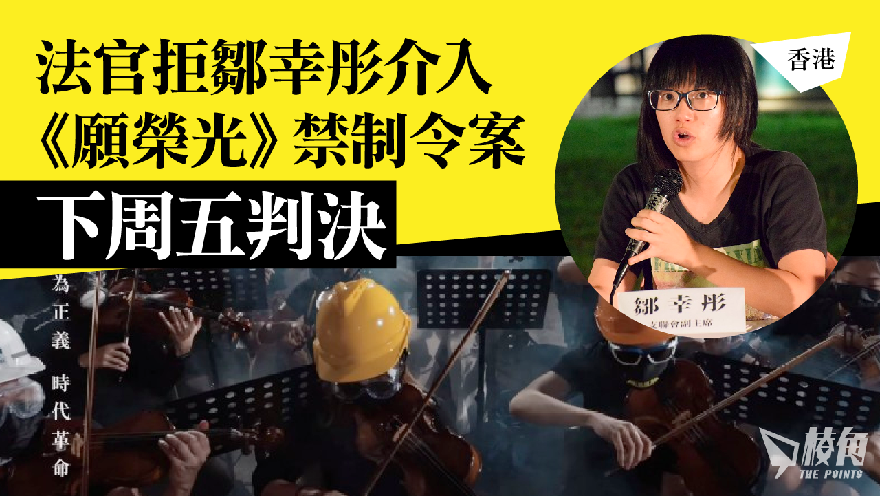 政府就反修例運動期間創作的歌曲《願榮光歸香港》申請禁制令一案,早前有消息指目前正還押的鄒幸彤申請介入,消息指法官陳健強以對方沒有犯下禁制令所列出的行為為由拒絕其申請,並決定於下周五(7月28日)裁決。