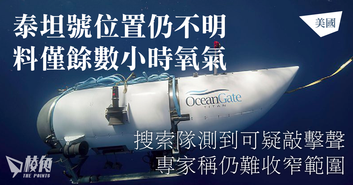 載有5人的觀光潛水器泰坦號目前仍然下落不明,根據估計目前船內僅有數小時氧氣供應,故由多國聯合組成的搜救隊正盡大擴大搜索範圍,包括出動能潛入深海19,000英尺的搖控探測機。就早前美國海岸防衛隊指曾探測到可疑敲擊聲一事,多名專家指出目前仍未知聲音來源是否來自泰坦號,而且仍未找到聲音來源的位置,故仍難以收窄搜索範圍。