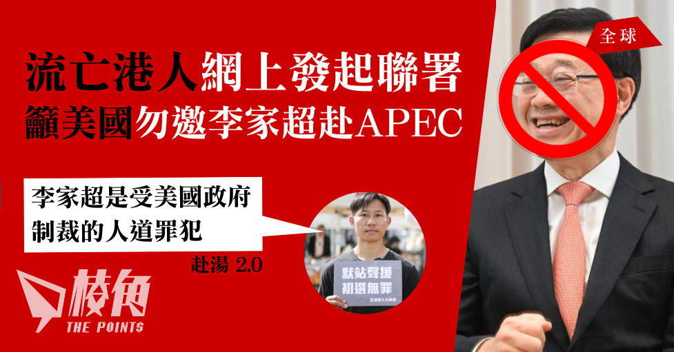 美國將於11月舉行亞太經濟合作會議(APEC),早前有美國國會議員聯署,呼籲主辦方不要邀請行政長官李家超出席。已移民台灣港人「赴湯」於周五(9日)亦發起網上聯署,要求美國政府不要邀請李家超出席APEC,聯署指李家超曾多次支持中國作出侵犯香港人權的行為,又強調李家超已被美國因侵犯人權制裁,是人道罪犯。