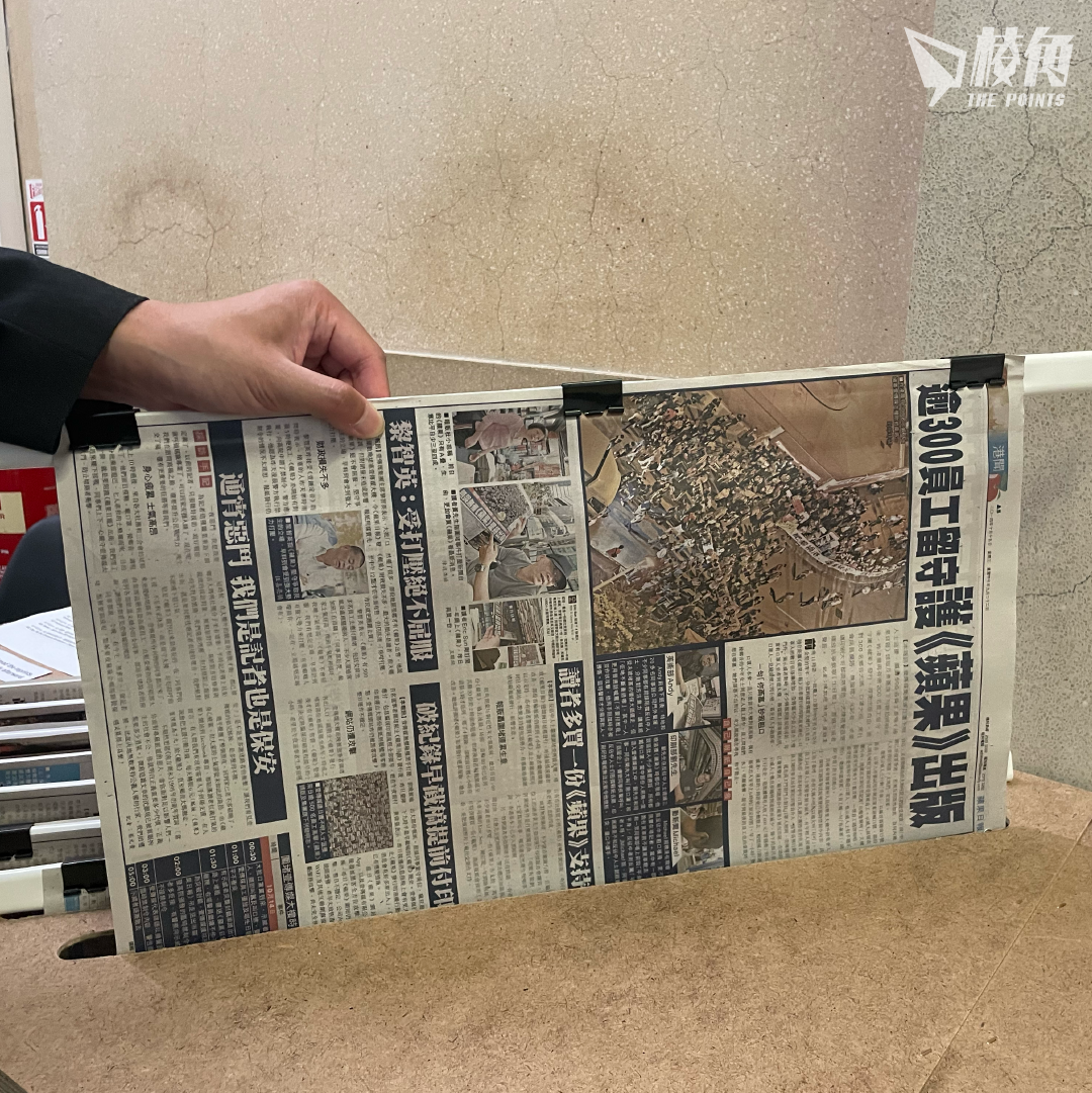 場內的數個角落,有多個自製的報紙架,隨意抽起,可見歷年《蘋果》的經典頭版,見證香港回歸26年的變遷。回想《國安法》實施當天,各報章頭版「清一色」的藍天歌頌政府,唯獨《蘋果》堅守風骨,批評惡法催毀香港。