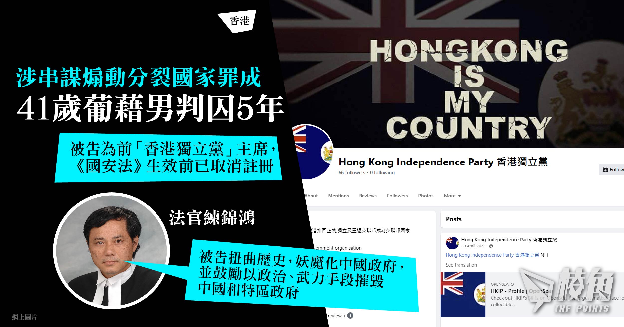 一名41歲葡籍男音樂教師原被控串謀煽動罪,其後改控《國安法》「串謀煽動他人實施分裂國家」罪,周四(11日)判刑囚5年。被告為前「香港獨立黨」主席,被指在網上發佈多篇帖文,內容包括呼籲香港成為獨立國家、眾籌、向僱傭兵索取報價以「摧毀政府勢力」等。法官練錦鴻指被告煽動港人對中港仇恨,雖然被告認罪,但認為情節嚴重,故判囚5年。
