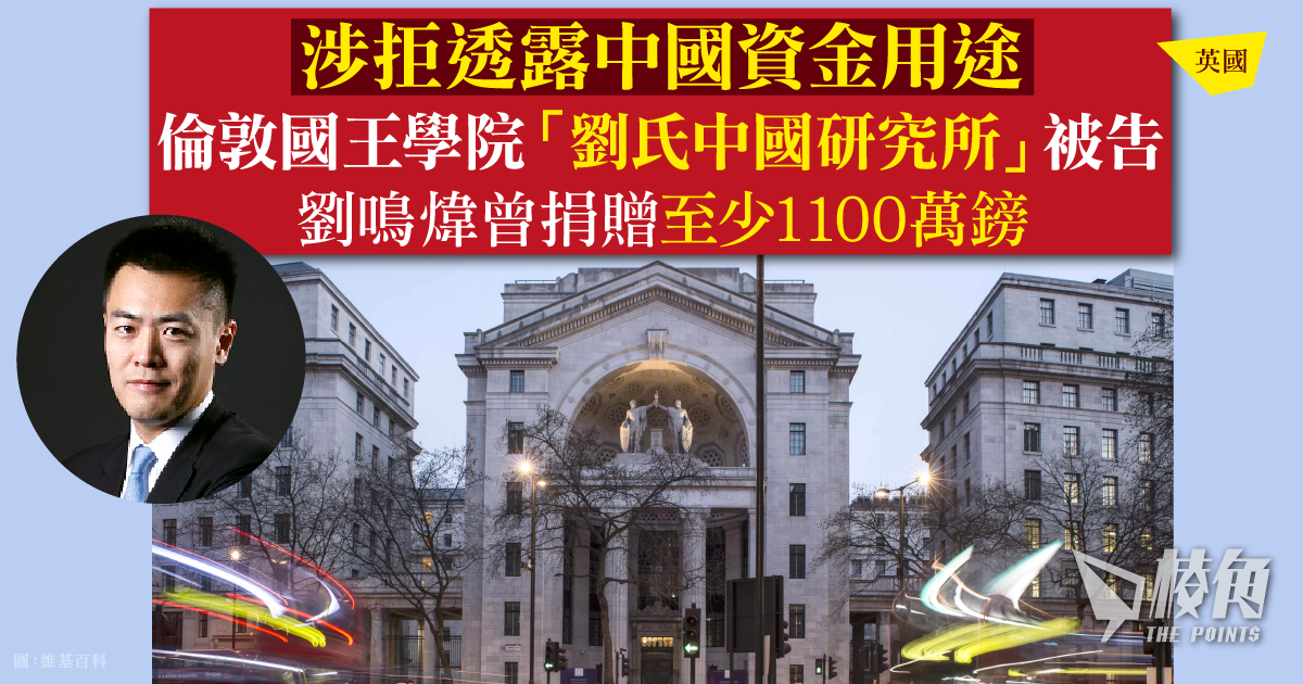英國非牟利組織「英中透視」(UK-China Transparency)早前公布一份研究報告,質疑倫敦國王學院(King’s College London)的「劉氏中國研究所」與中國關係密切,及收取來自中國的資金。報告就該資金的用途向學院以《資訊自由法》要求揭露資訊不果,其後向初級法庭起訴,爭取資訊公開。