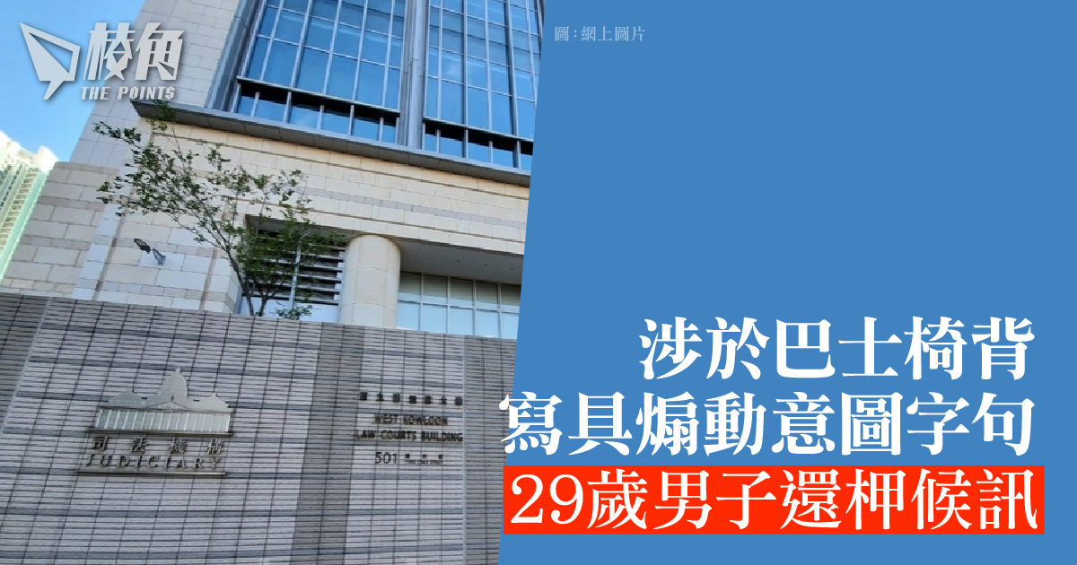 國安處周二(25日)起訴一名男子,涉嫌在3月至4月期間,持續在不同的公共巴士乘客座位椅背上寫上具煽動意圖的字句,內容包括煽動他人引起對中央及香港特區政府憎恨,被控3項「出於煽動意圖作出一項或多項具煽動意圖的作為」罪及2項「摧毀或損壞財產」罪。案件同日於西九龍裁判法院首次提堂,控方反對被告保釋。國安法指定法官蘇惠德將押後案件至8月22日再訊,被告還押候訊。