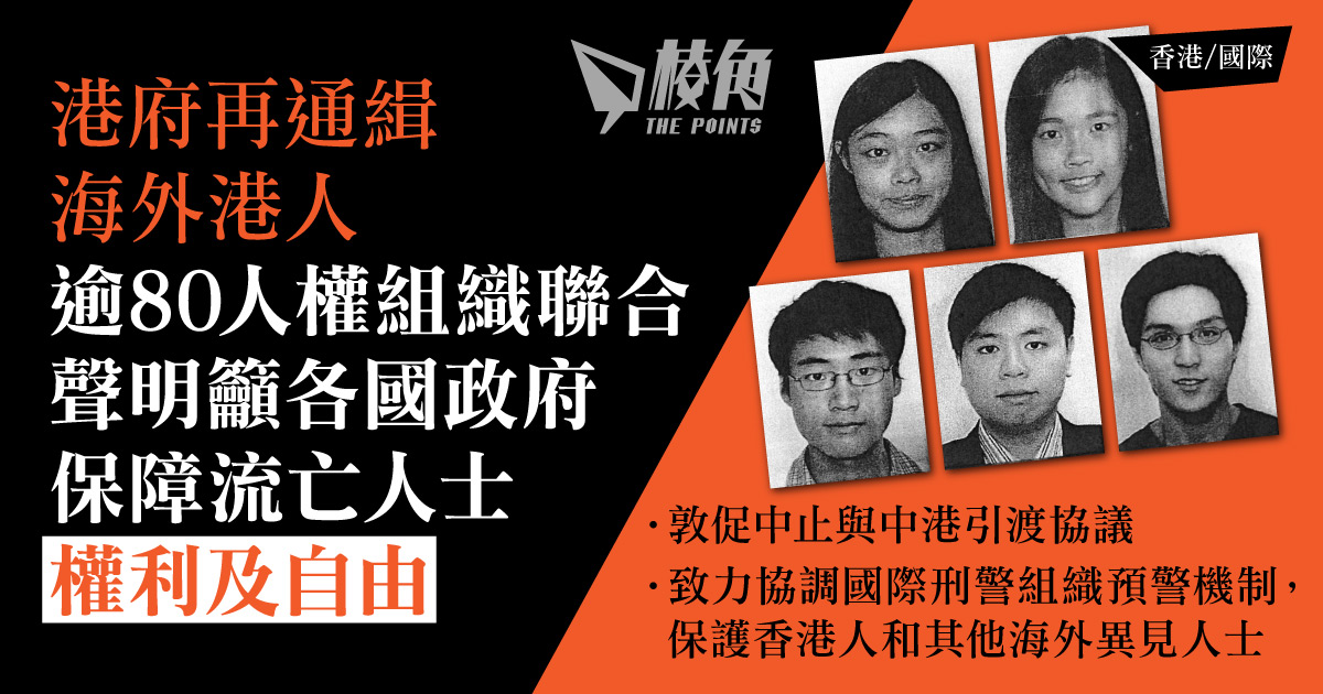 聲明呼籲各國政府採取措施保障流亡海外香港社運人士的權利和自由,尤其是已獲得政治庇護並曾遭受北京威脅的人士,並讉責譴責針對羅冠聰、郭榮鏗、許智峯、任建峰、郭鳯儀、劉祖廸、袁弓夷和蒙兆達的打壓。86個人權組織呼籲英國、美國、加拿大、澳洲、紐西蘭和歐洲聯盟等多國政府重申《國安法》不適用於其司法管轄區,並譴責港府發出懸紅通緝令,強調這些手令在其司法管轄區並無法律效力。