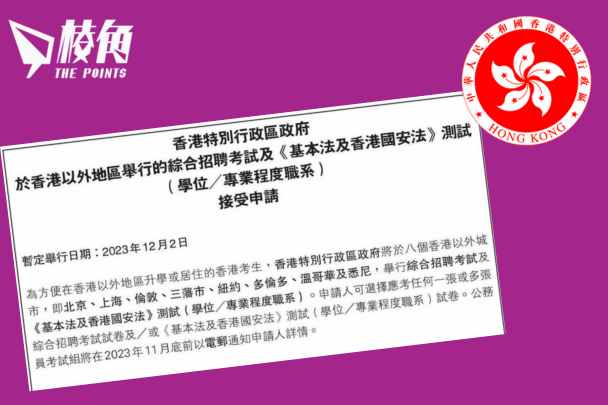 去年香港公務員辭職人數創回歸來新高,政府為解決人才荒,除了放寬容許未畢業的大學生投考公務員,而且將目光也瞄向海外,並曾在上海等中國城市開辦招聘講座。香港公務事務局日前刊登廣告,暫定在12月2日於北京、上海、三藩市、紐約、多倫多、温哥華及雪梨等8個香港以外城市,舉行綜合招聘考試及《基本法及香港國安法》測試(學位/專業程度測試)。申請人可以選擇考任何一張或多張考試卷。